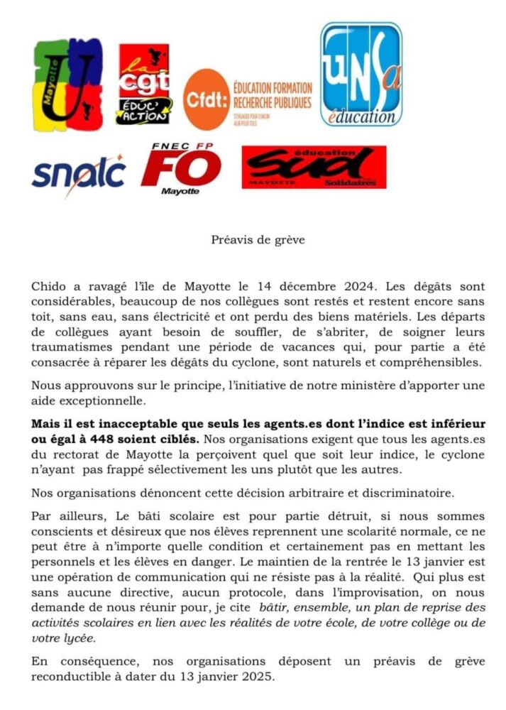 Les syndicats de l’Éducation nationale de Mayotte, réunis sous plusieurs bannières (CGT, UNSA, SNALC, FO, CFDT, SUD), viennent de déposer un préavis de grève reconductible à partir du 13 janvier 2025 pour dénoncer les décisions arbitraires prises dans la gestion de cette crise.