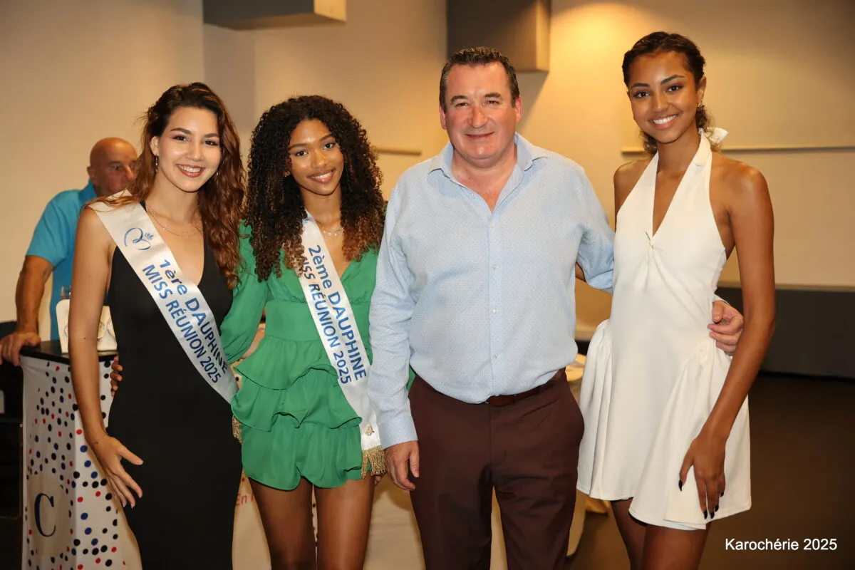 Marine Futol Miss Réunion 2024 entourée de Adriana Séverin 2e dauphine de Miss Réunion 2025 et Hannah Macé 1ère Dauphine de Miss Réunion 2025
