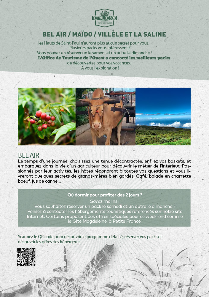 - Week-end du 4 et 5 mai – Hauts de Saint-Paul (Bel Air, Guillaume, Maïdo, Villèle, La Saline) : rencontre avec les producteurs agritouristiques, ateliers participatifs – distillation, café grillé, bouturages, récolte, balade en charrette boeuf… – découverte des exploitations, dégustations, déjeuner en table d’hôte.
