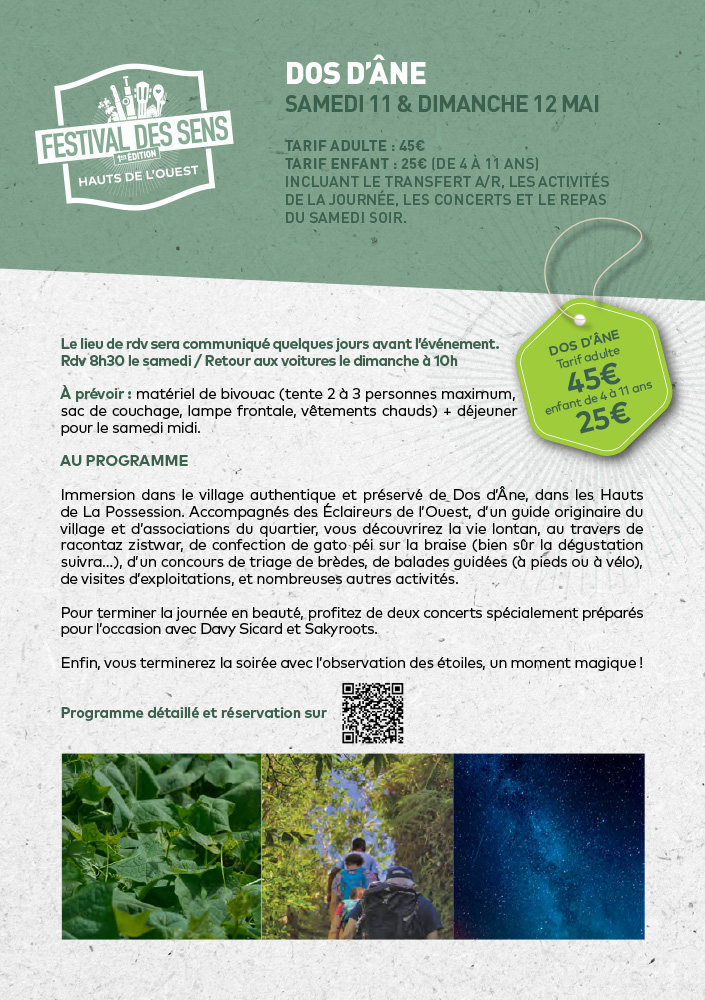 - Week-end du 11 et 12 mai – Dos d’Âne : bivouac, ateliers participatifs – gato lontan sur la braise, concours de triage brède chouchou, initiation permaculture… – concerts, observation des étoiles, balades guidées à pieds ou à vélos électriques, petit déjeuner, apéro et dîner.