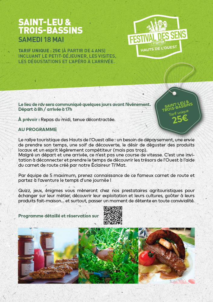 - Samedi 18 mai – Hauts de Saint-Leu et Trois-Bassins : rallye touristique avec carnet de route, énigmes, visites d’exploitations labellisées, dégustations de produits de la ferme transformés : foie gras, café, biscuits au géranium, jus…