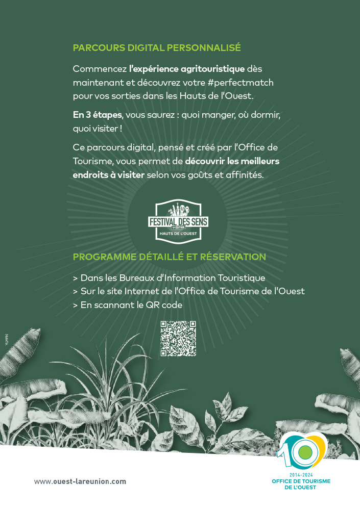 L’Office de Tourisme de l’Ouest, sous l’impulsion de sa Présidente Roxanne Pausé-Damour, présente la première édition du Festival Des Sens. Il s’inscrit dans une démarche globale qui vise à mettre en avant l’agritourisme réunionnais.