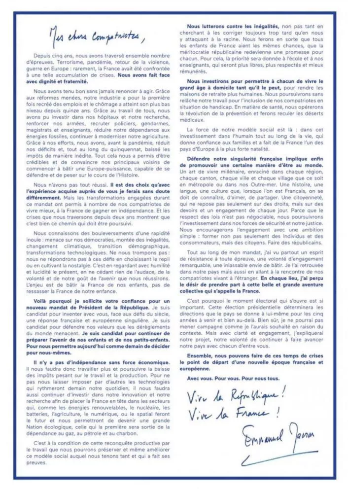 Pour toucher toute la France, Emmanuel Macron a décidé de diffuser sa « Lettre aux Français » dans toute la presse régionale. Dans sa lettre, il écrit entre autres : «  Je suis candidat pour inventer avec vous, face aux défis du siècle, une réponse française et européenne singulière. Je suis candidat pour défendre nos valeurs que les dérèglements du monde menacent. Je suis candidat pour continuer de préparer l’avenir de nos enfants et de nos petits-enfants. Pour nous permettre aujourd’hui comme demain de décider pour nous-mêmes. J’ai perçu partout un esprit de résistance à toute épreuve, une volonté d’engagement remarquable, une inlassable envie de bâtir. Je l’ai retrouvée partout dans notre pays mais aussi en allant à la rencontre de nos compatriotes vivant à l’étranger. J’ai perçu en chaque lieu le désir de prendre part à cette belle et grande aventure collective qui s’appelle la France. ..»
