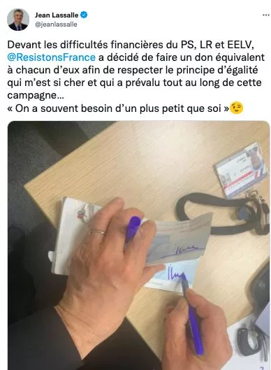 “Devant les difficultés financières du PS, LR et EELV, Résistons (son parti, NDLR) a décidé de faire un don équivalent à chacun d’eux afin de respecter le principe d’égalité qui m’est si cher et qui a prévalu tout au long de cette campagne”, a tweeté lundi 11 avril 2022, dans la soirée le député, photo à l’appui où on le voit remplir plusieurs chèques.