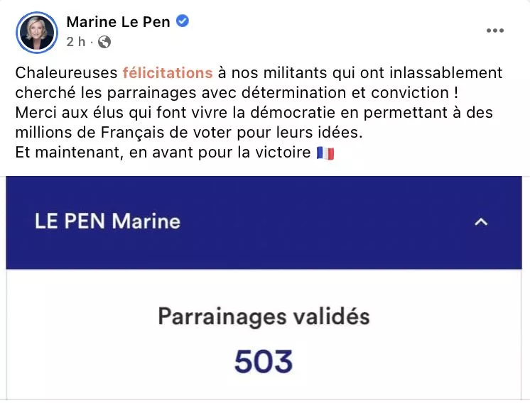 Sur le site du Conseil constitutionnel, on peut voir que Marine Le Pen, Eric Zemmour et Nicolas Dupont-Aignan ont enfin eu leurs 500 parrainages.