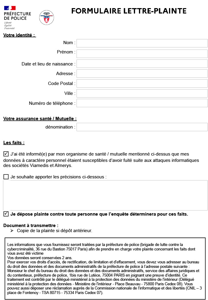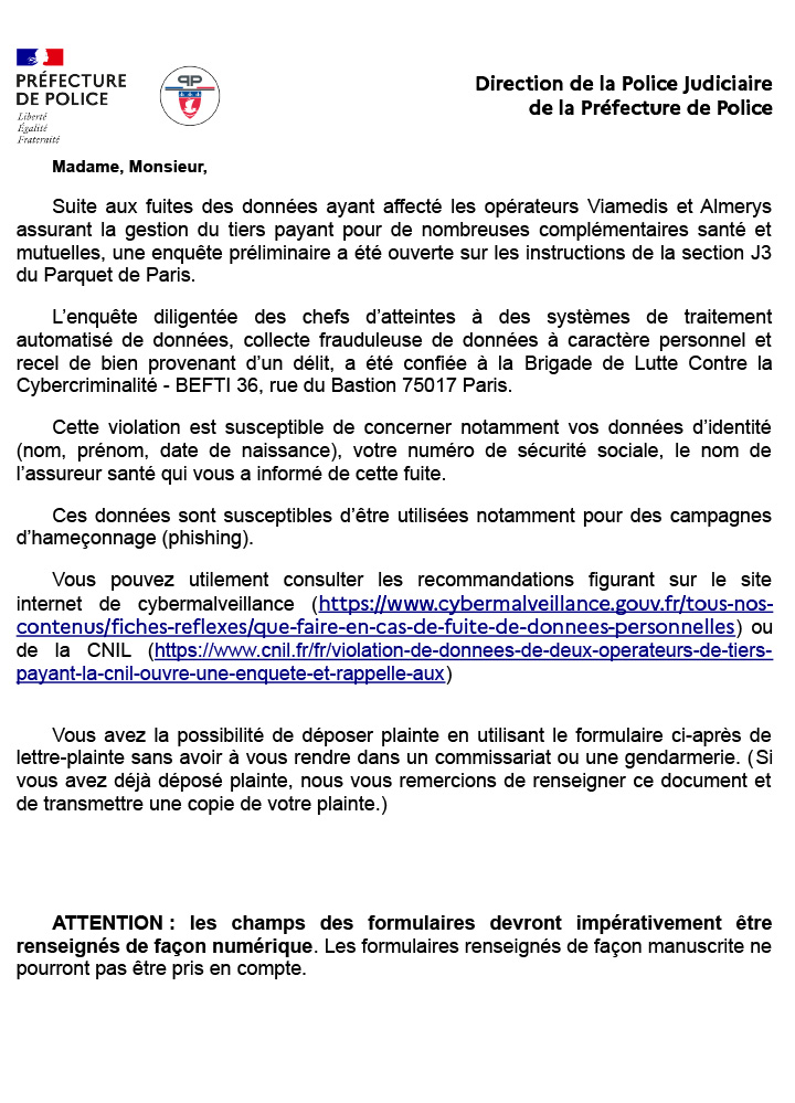 Dépôt de plainte : Les mutuelles et prestataires concernés ont déposé des plaintes, et les citoyens ont également la possibilité de déposer plainte en utilisant le formulaire de lettre-plainte électronique via ce lien : https://www.cybermalveillance.gouv.fr/medias/2024/02/BL2C_lettre_plainte_fuites_Mutuelles.pdf