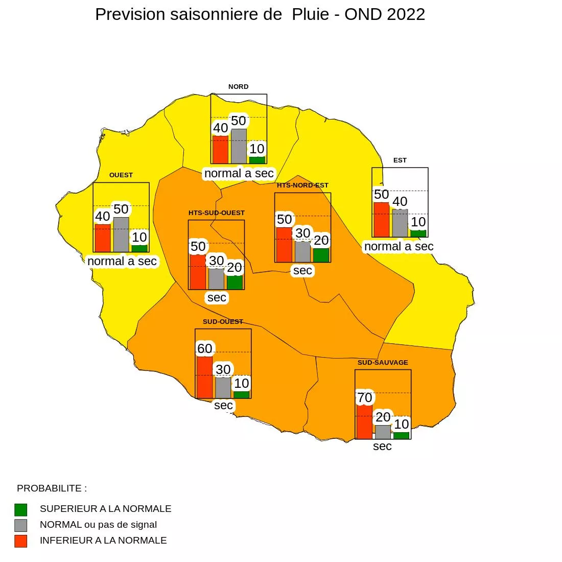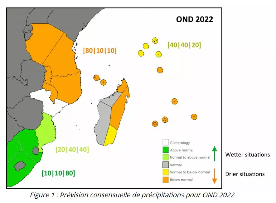 Etant donné l’impact persistant des phénomènes océanique qui affectent le Sud-Ouest de l’Océan Indien (La Nina dans le Pacifique et l’IOD en phase négative dans l’océan Indien), la prévision de précipitations pour le prochain trimestre (Octobre-Novembre-Décembre) reste cohérente avec celle du mois précédent. Un signal plus sec que la normale est attendu sur une grande partie de l’île avec plus d’incertitudes sur le versant est. Les moyennes de température devraient s’avérer inférieures à la normale.