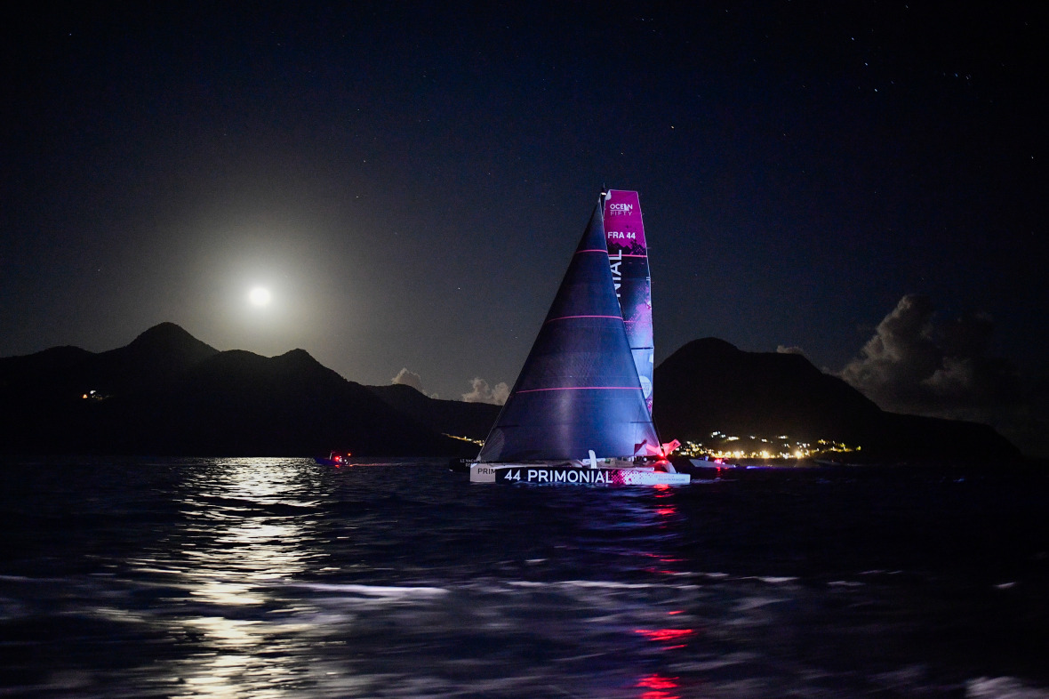 C’est dans la nuit noire, éclairée par la pleine lune, et arrosée par une pluie fine, que Primonial a coupé la ligne d’arrivée de la Transat Jacques Vabre 2021 mouillée à l’entrée de la baie de Fort-de-France. Les deux marins, Sébastien Rogues et Matthieu Souben, sont les premiers des 150 encore en course à rallier la Martinique. Dès le passage du Rocher du Diamant, au sud de l’île, ils ont commencé à célébrer, avant de laisser totalement exploser leur joie au passage de la ligne.