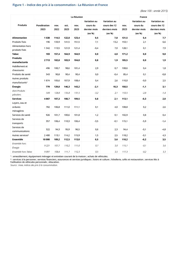 En novembre 2023, l’indice des prix à la consommation augmente de 0,5 % à La Réunion après +0,6 % en octobre. Les prix des services, des produits manufacturés et de l’alimentaire continuent d’augmenter, tandis que ceux de l’énergie baissent.