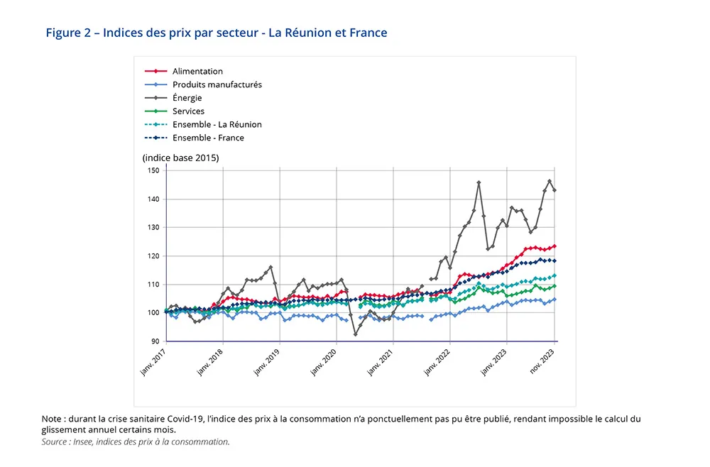 En novembre 2023, l’indice des prix à la consommation augmente de 0,5 % à La Réunion, après +0,6 % en octobre. Les tarifs de l’énergie diminuent, après quatre mois consécutifs de hausse. Les prix continuent d’augmenter dans les services, les produits manufacturés et l’alimentaire.