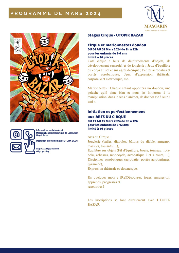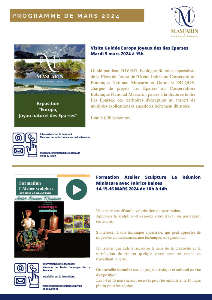 Pour les vacances de Mars 2024, Mascarin Le Jardin Botanique de La Réunion met en place un petit programme pour que vous puissiez découvrir le Jardin sous toutes ses facettes et faire des activités en familles