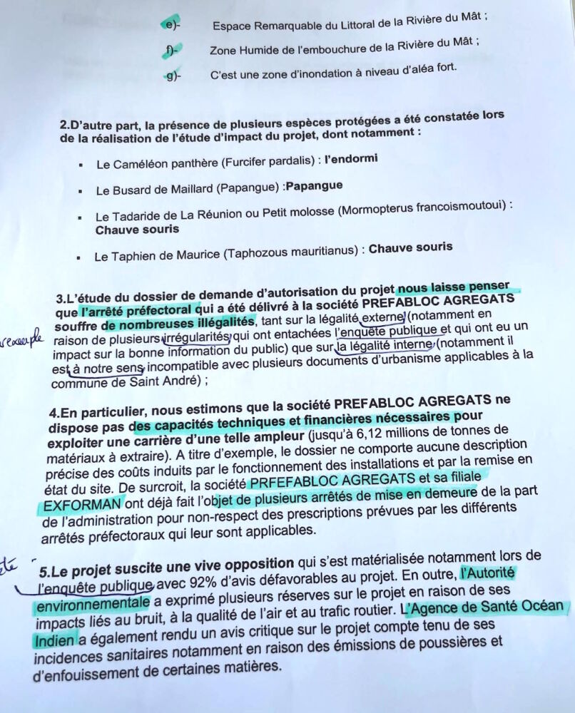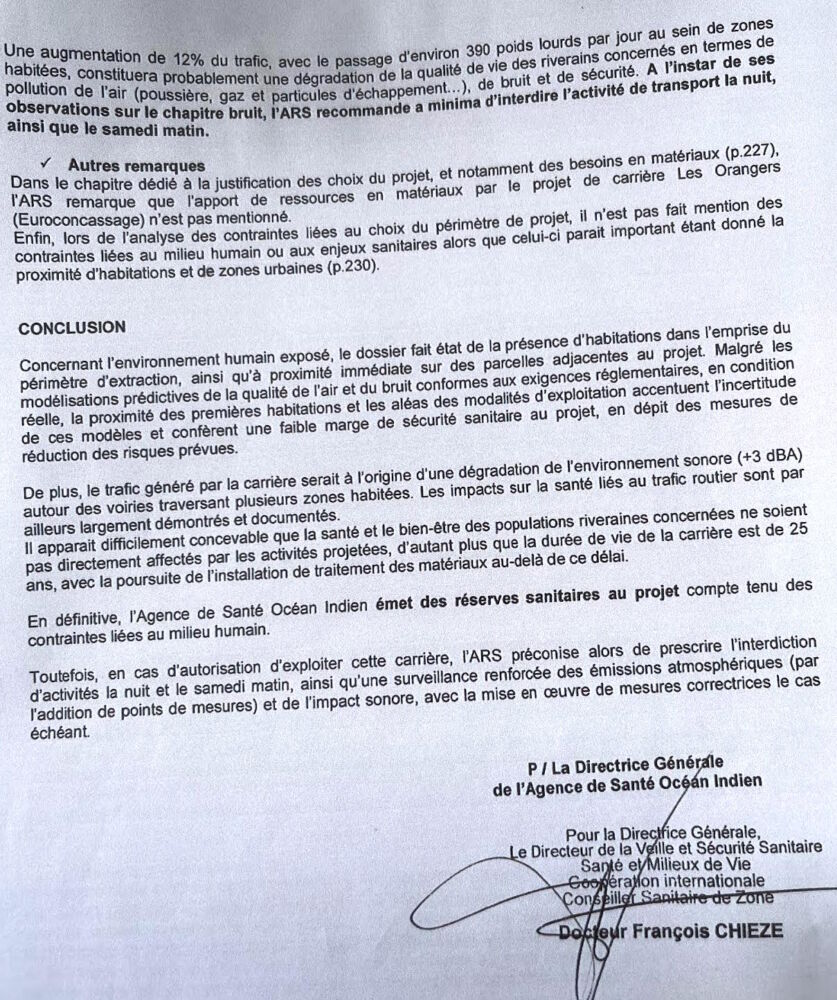 L’enquête publique avait démarré en 2019 et, en dépit des avis négatifs de la majorité des habitants ainsi que de la pétition qui avait recueilli plus de 3 000 signatures, l’autorisation préfectorale est sortie en août 2022 pour permettre la création de cette carrière et la réalisation d’une unité de concassage. Projets porté par la société Préfabloc Agrégats. Rappelons que la mairie de Saint-André tant sous Jean-Paul Virapoullé début 2020 que durant l’actuelle mandature de Joé Bédier a toujours refusé le permis de construire pour le concassage. Au cours de la conférence de presse de ce matin, animée notamment par Julie Dolorosa, en présence de nombreux riverains, GUEP a annoncé qu’elle a déposé, le 24 novembre dernier, auprès du tribunal administratif, un recours en annulation de l’arrêté préfectoral, qui avait été signé par la secrétaire générale de la préfecture, Régine Pam. Ecoutez Julie Dolorosa ainsi que les autres membres du bureau de GUEP. Ils sont au micro d’Yves Mont-Rouge :