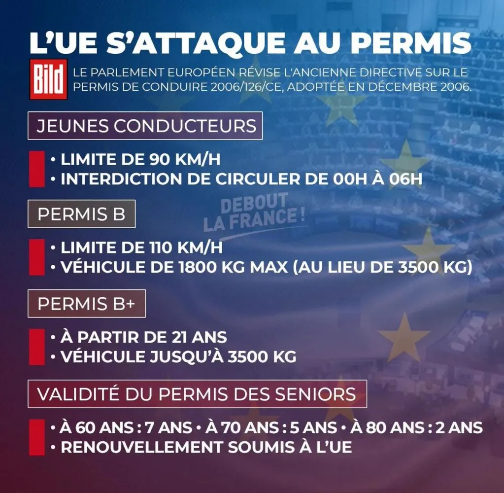 Selon cette infographie, les jeunes conducteurs se verraient imposer une limite de vitesse de 90 km/h et une interdiction de conduire de minuit à 6 heures du matin. Le permis B serait restreint aux véhicules de 1 800 kg maximum, avec la création d’un permis « B + » nécessaire pour conduire les véhicules de 1 800 à 3 500 kg, réservé aux conducteurs de plus de 21 ans. De plus, la limite de vitesse pour tous les véhicules serait plafonnée à 110 km/h dans l’ensemble de l’UE, et les conducteurs seniors devraient renouveler leur permis régulièrement (tous les sept ans après 60 ans, puis tous les cinq ans après 70 ans et tous les deux ans après 80 ans), avec ce renouvellement soumis à l’UE.