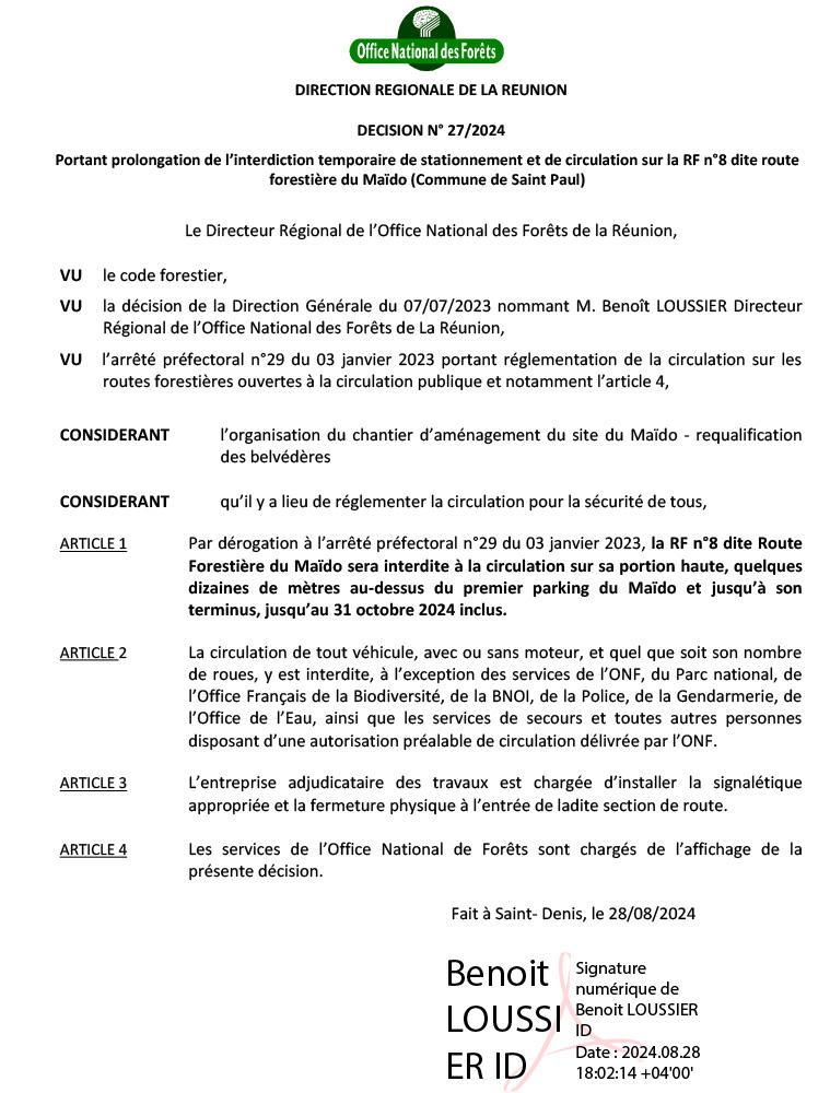 En raison de travaux d’aménagement au niveau du site du Maïdo, l’interdiction totale à la circulation (sauf ayant-droit) sur la portion haute de la RF n°8 dite route forestière du Maïdo (quelques dizaines de mètres au-dessus du premier parking du Maïdo et jusqu’à son terminus) doit être prolongée jusqu’au jeudi 31 octobre 2024.