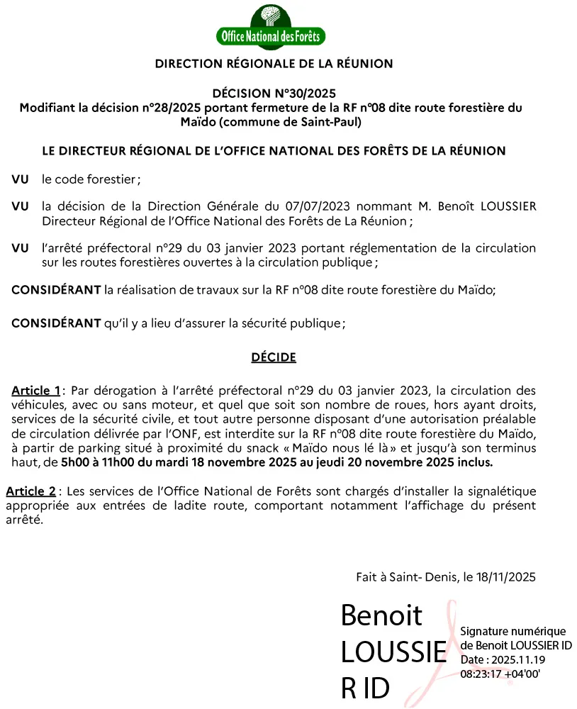 La route forestière du Maïdo (RF8) fera l’objet d’une prolongation de fermeture à la circulation. Cette fermeture concerne le tronçon allant du parking à proximité du snack « Maïdo nous lé là » jusqu’au parking terminus. Elle sera effective de 5h00 à 11h00 le mercredi 19 et le jeudi 20 novembre 2025. La décision n°30-2025 encadrant cette mesure a été publiée et est disponible en consultation.