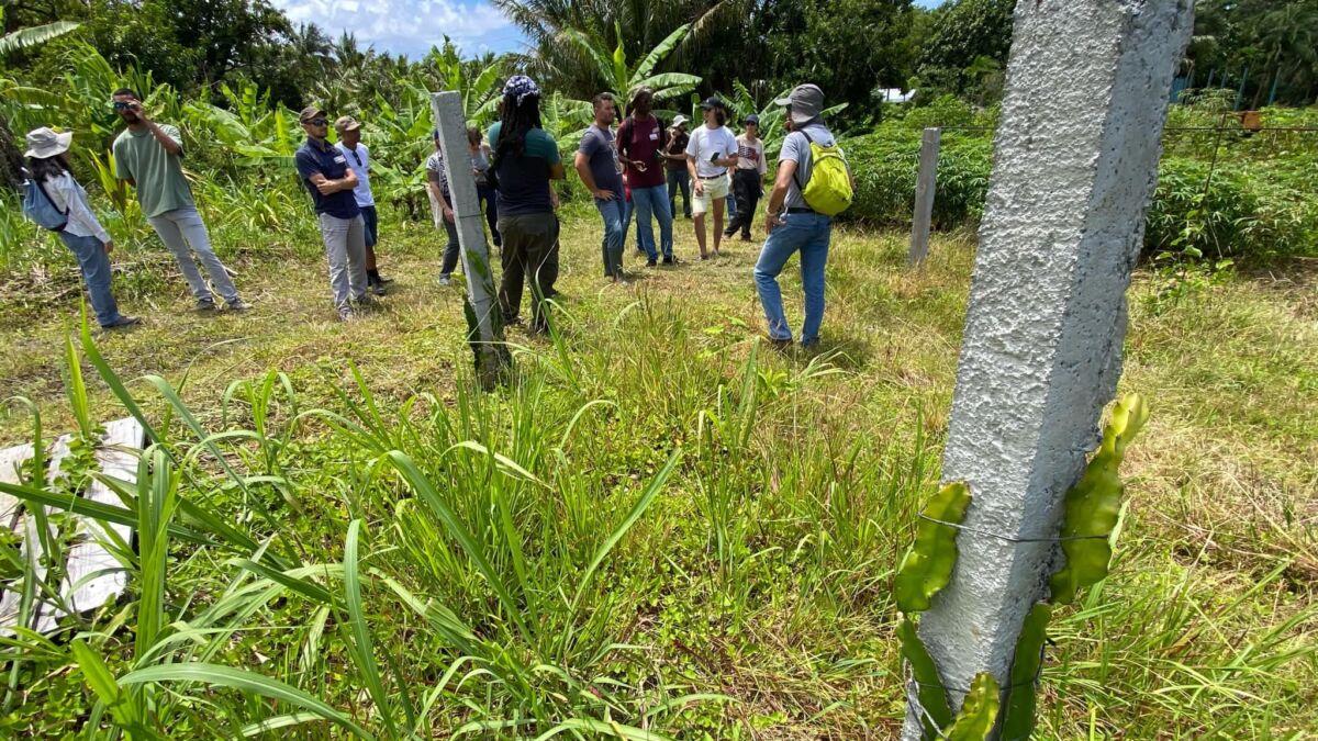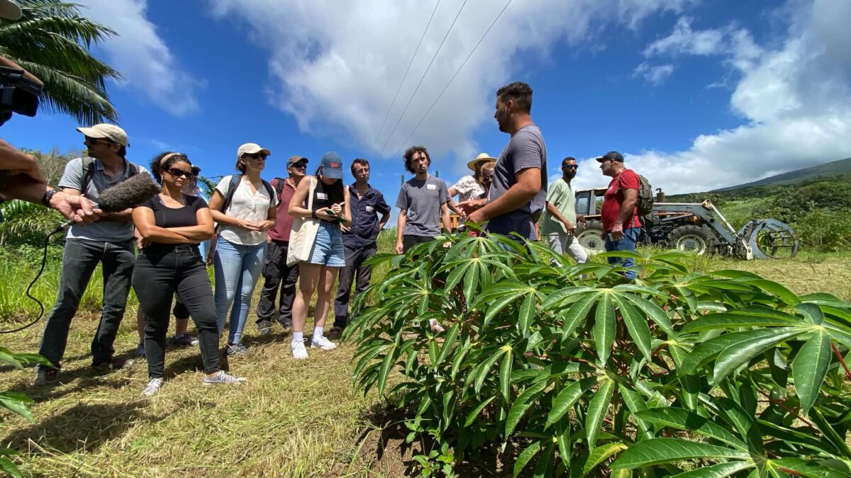 Sur l’exploitation de Floriant Hoareau, les participants découvrent un modèle de diversification exemplaire avec des cultures de canne, banane, manioc, palmiste et pitaya, fruit de la passion, toutes produites sans utilisation de pesticides.