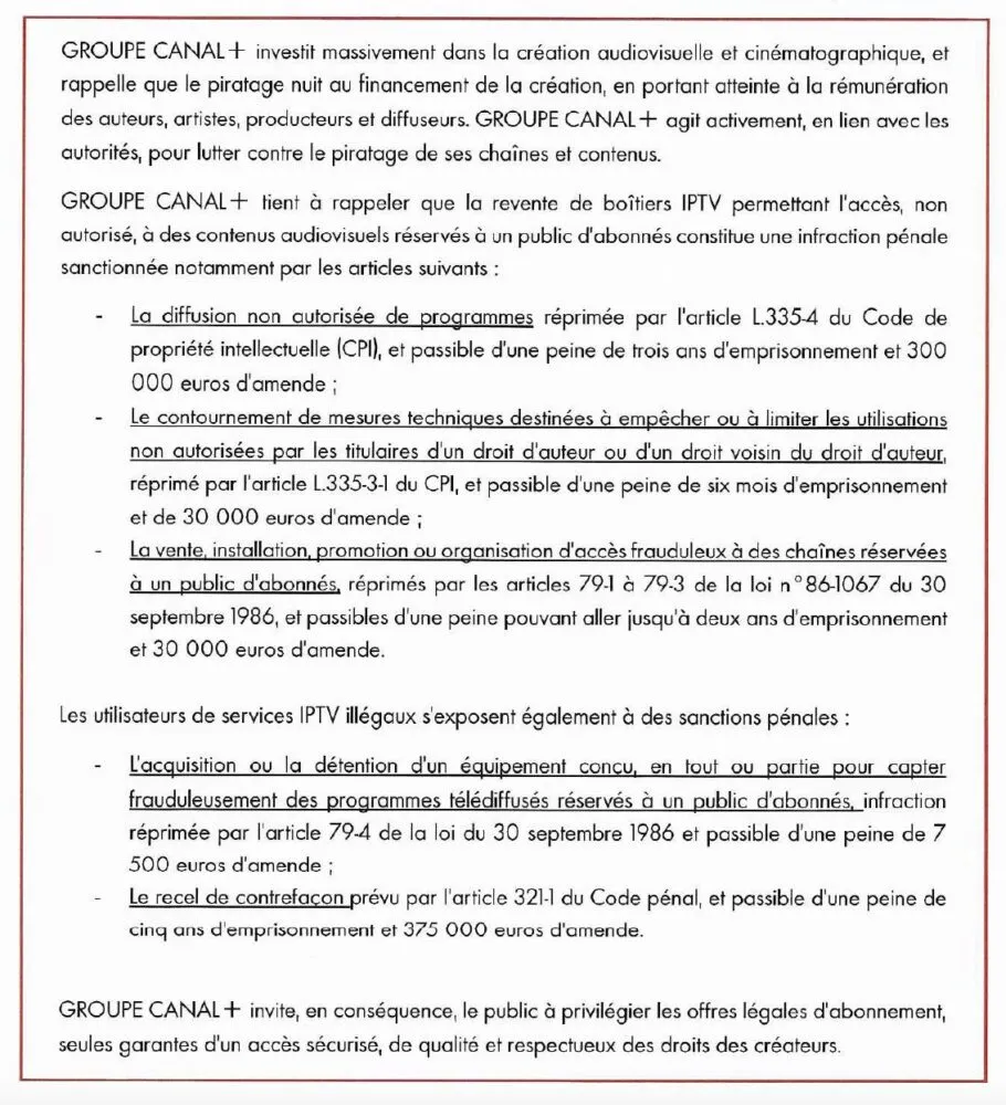 GROUPE CANAL+ tient à rappeler que la revente de boîtiers IPTV permettant l’accès, non