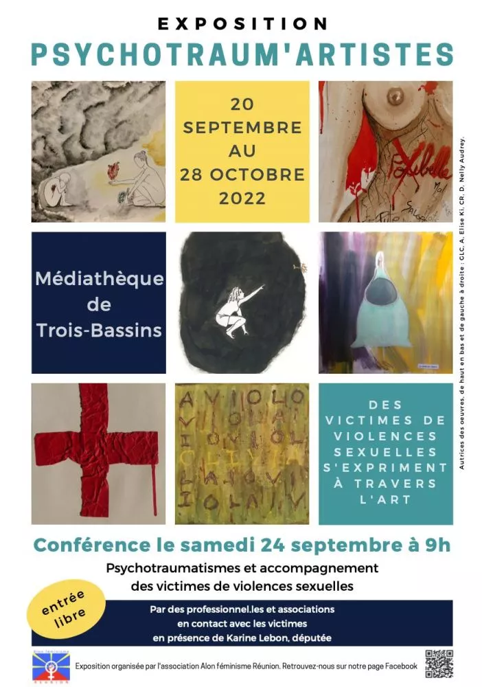 Psychotraum’Artistes est une exposition sur les violences sexuelles et les psychotraumatismes qui en résultent. La première édition a eu lieu du10 avril au 1er mai 2021 à la Médiathèque du centre-ville du Tampon, et la seconde en novembre 2021, à la médiathèque de Saint-Pierre.