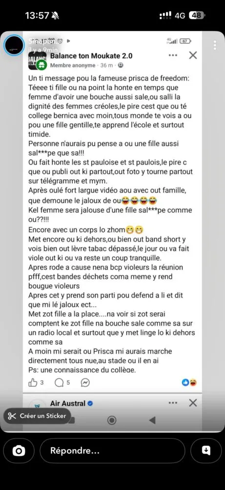 5. Au lieu laisse message en anonyme, pourquoi sa pas Di en face la personne concernée. La Réunion demoun y changera jamais, lé grave d’être frustré comme ça. Chacun fait ce qu’il veut de sa vie, mi comprend pas demoun la besoin rabaisse les autres croyant y sa fé avance à zot…