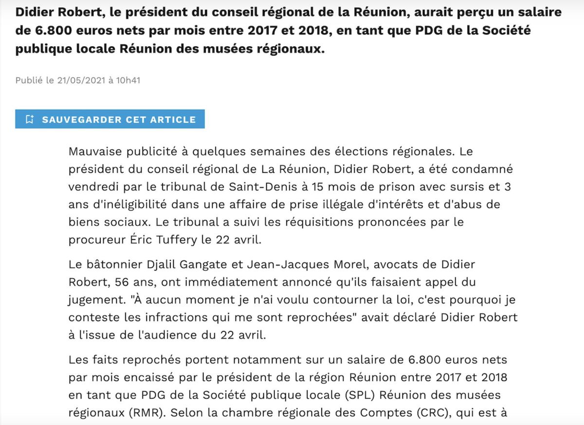 Trois jours après la condamnation du président actuel de la Région, Didier Robert pour prise illégale d’intérêts, la presse nationale relaie médiatiquement ce dossier, qui risque fort d’entacher l’image du candidat à sa propre succession aux scrutins du 20 et 27 juin.