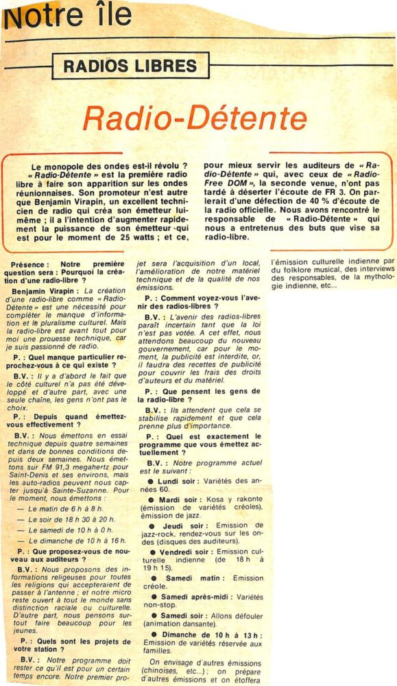 1981 Radio Détente a émis 4 jours avant Free Dom par La Rédaction 15 septembre 1981 1 min de lecture Radio Détente a aujourd’hui disparu. Ne manquez pas toute l’actualité de La Réunion ! Abonnez-vous à la newsletter de Free Dom ! Valider Partager Facebook Twitter Pinterest Linkedin Whatsapp Reddit Email Vous pourriez être intéressé par 14 janvier 2023 69 migrants sri lankais sont arrivés au Port à 4h30 23 décembre 1981 Lettre ouverte à un commentateur de Radio Free Dom 1 décembre 1981 Radios libres : Noël Caro s’indigne La Rédaction Laisser un commentaire Annuler la réponseYour email address will not be published. Enregistrer mon nom, mon e-mail et mon site dans le navigateur pour mon prochain commentaire. Current ye@r * Leave this field empty Article précédent Onze démissions à radio Free Dom Article suivant Sonia arrive à Free Dom en septembre 1981 Articles récents... Hommage à Johnny Hallyday sur Free Dom 2 ce 5 décembre Mardi 30 décembre 2025 – Météo, éphéméride et horoscope du jour Saint-Joseph : découverte de 2337 plants de cannabis, arrestation de 2 individus Point sur le réseau routier départemental, 29 décembre à 16H30 Suicide sur le pont de la Rivière d’Abord : importante mobilisation des secours et des forces de l’ordre Radier submergé à Ilet Furcy : la route de Cilaos fermée à la circulation cette nuit Fortes pluies : appel à la plus grande prudence à Saint-Paul Saint-Gilles-les-Bains : une route impraticable, les riverains montent au créneau (VIDEOS) Très grands excès de vitesse : un délit passible de prison depuis le 29 décembre 2025 Fermeture temporaire du sentier de la Canalisation des Orangers (cirque de Mafate)