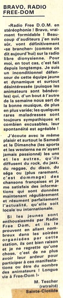 1981 Radio Free Dom, le coup de cœur d’un lecteur de Télé 7 Jours par La Rédaction 18 novembre 1981 1 min de lecture Ne manquez pas toute l’actualité de La Réunion ! Abonnez-vous à la newsletter de Free Dom ! Valider Partager Facebook Twitter Pinterest Linkedin Whatsapp Reddit Email Vous pourriez être intéressé par 14 janvier 2023 69 migrants sri lankais sont arrivés au Port à 4h30 23 décembre 1981 Lettre ouverte à un commentateur de Radio Free Dom 1 décembre 1981 Radios libres : Noël Caro s’indigne La Rédaction Laisser un commentaire Annuler la réponseYour email address will not be published. Enregistrer mon nom, mon e-mail et mon site dans le navigateur pour mon prochain commentaire. Current ye@r * Leave this field empty Article précédent Radio Free Dom, la première radio en stéréo à La Réunion ! Article suivant Nouvelle soirée dansante organisée par radio Free Dom Articles récents... Mercredi 31 décembre 2025 – Météo, éphéméride et horoscope du jour Hommage à Johnny Hallyday sur Free Dom 2 ce 5 décembre Mardi 30 décembre 2025 – Météo, éphéméride et horoscope du jour Saint-Joseph : découverte de 2337 plants de cannabis, arrestation de 2 individus Point sur le réseau routier départemental, 29 décembre à 16H30 Suicide sur le pont de la Rivière d’Abord : importante mobilisation des secours et des forces de l’ordre Radier submergé à Ilet Furcy : la route de Cilaos fermée à la circulation cette nuit Fortes pluies : appel à la plus grande prudence à Saint-Paul Saint-Gilles-les-Bains : une route impraticable, les riverains montent au créneau (VIDEOS) Très grands excès de vitesse : un délit passible de prison depuis le 29 décembre 2025