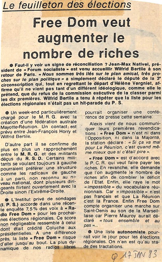 1983 Radio Free Dom se présente aux élections régionales (un nouveau canular !) par La Rédaction 17 janvier 1983 1 min de lecture Ne manquez pas toute l’actualité de La Réunion ! Abonnez-vous à la newsletter de Free Dom ! Valider Partager Facebook Twitter Pinterest Linkedin Whatsapp Reddit Email Vous pourriez être intéressé par 10 décembre 1983 Une pub qui termine ces trois années d’existence 31 août 1983 Camille Sudre : « Le but poursuivi par Radio Free Dom : ne jamais se prendre au sérieux et ouvrir l’antenne à tous ceux qui veulent s’exprimer, sans aucune exclusive » 2 juillet 1983 Corneil Domitile gagne le concours de la chanson organisé par Radio Free Dom La Rédaction Laisser un commentaire Annuler la réponseYour email address will not be published. Enregistrer mon nom, mon e-mail et mon site dans le navigateur pour mon prochain commentaire. Current ye@r * Leave this field empty Article précédent « Le diable Ucor » avec Mme Aude et le « Who’s Who » avec la malicieuse Pascaline Article suivant Élections régionales : les candidats ne doivent dire ni « oui » ni « non » à l’antenne Articles récents... Mercredi 31 décembre 2025 – Météo, éphéméride et horoscope du jour Hommage à Johnny Hallyday sur Free Dom 2 ce 5 décembre Mardi 30 décembre 2025 – Météo, éphéméride et horoscope du jour Saint-Joseph : découverte de 2337 plants de cannabis, arrestation de 2 individus Point sur le réseau routier départemental, 29 décembre à 16H30 Suicide sur le pont de la Rivière d’Abord : importante mobilisation des secours et des forces de l’ordre Radier submergé à Ilet Furcy : la route de Cilaos fermée à la circulation cette nuit Fortes pluies : appel à la plus grande prudence à Saint-Paul Saint-Gilles-les-Bains : une route impraticable, les riverains montent au créneau (VIDEOS) Très grands excès de vitesse : un délit passible de prison depuis le 29 décembre 2025