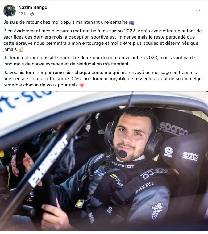 « Je suis de retour chez moi depuis maintenant une semaine. Bien évidemment mes blessures mettent fin à ma saison 2022. Après avoir effectué autant de sacrifices ces derniers mois la déception sportive est immense mais je reste persuadé que cette épreuve nous permettra à mon entourage et moi d’être plus soudés et déterminés que jamais.