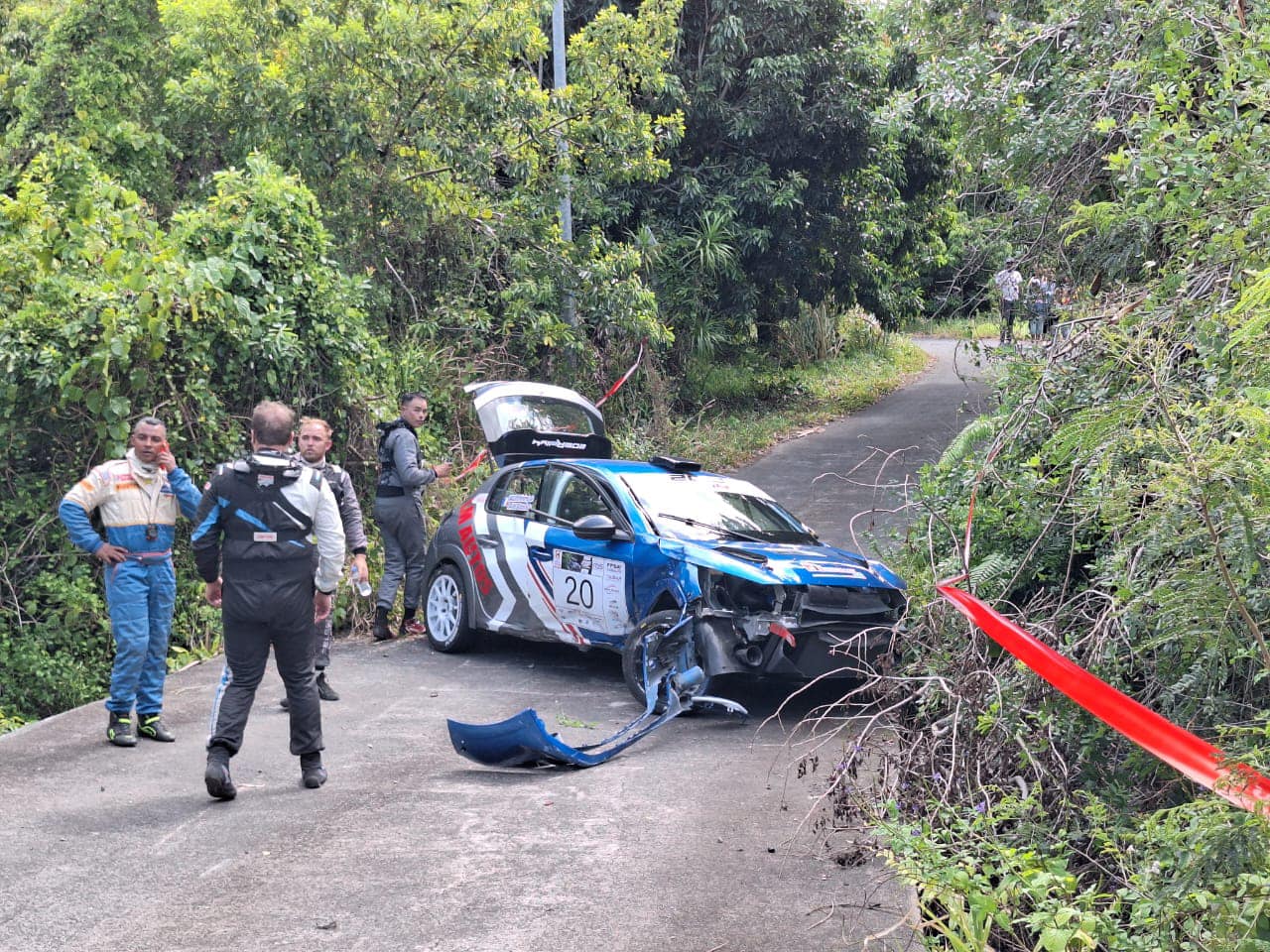 La voiture numéro 20  (Franck Lauret et Sebastien Ginestre) a effectué une sortie de route et se trouve en travers d’un radier. Ainsi, la décision de suspendre le départ  de la spéciale Sainte Marguerite à Saint-Benoît pour les voitures restant a été prise, en attendant l’arrivée du camion de dépannage.