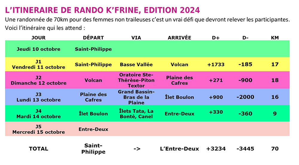 L’association Margot Run organise la 7ème édition de Rando K’frines. Le départ de cette 7ème édition se fera le 11 octobre à St-Philippe avec une arrivée prévue ce lundi 14 octobre à l’Entre-Deux.