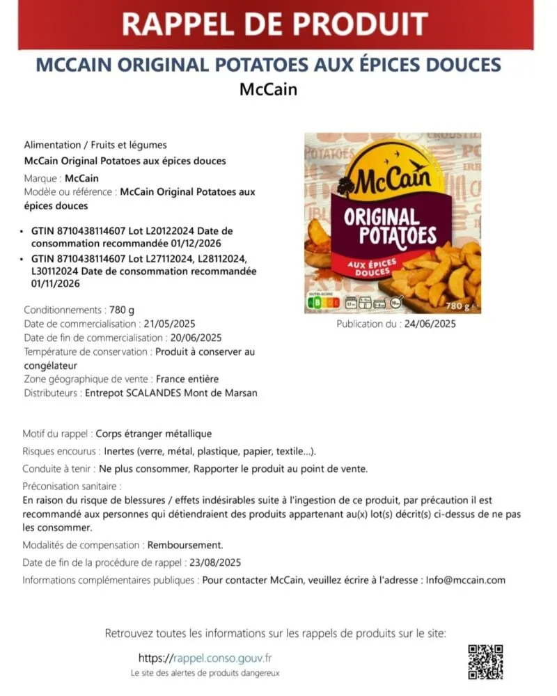 La célèbre marque McCain procède au rappel d’un lot de son produit Original Potatoes aux épices douces, en raison de la présence possible d’un corps étranger métallique dans certains emballages. Ce rappel de sécurité alimentaire a été publié officiellement le 24 juin 2025 sur le site gouvernemental dédié à la sécurité des consommateurs.