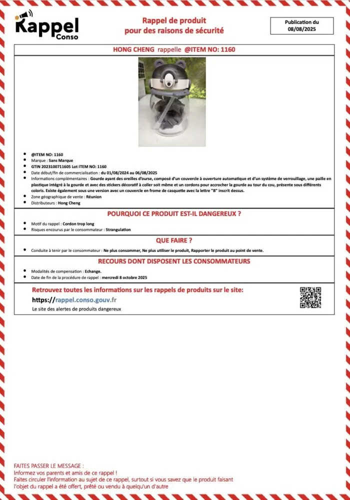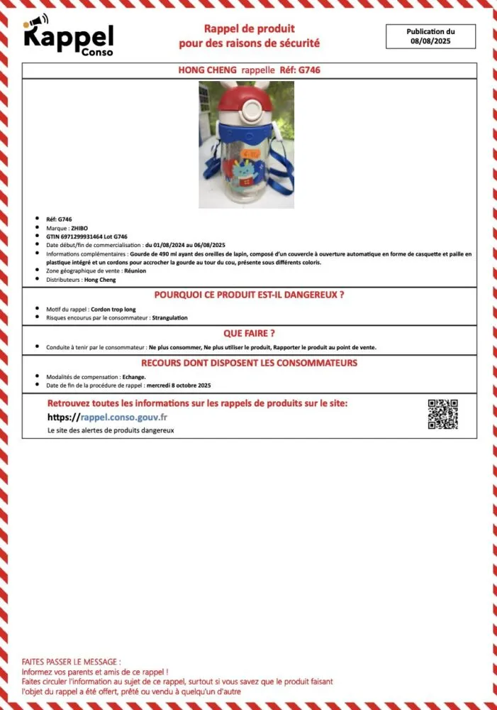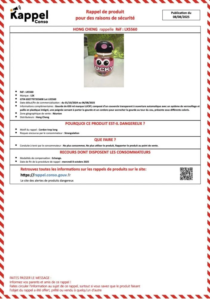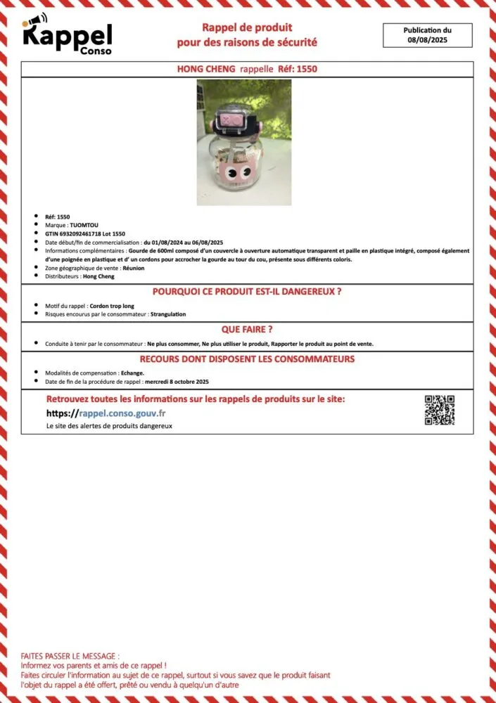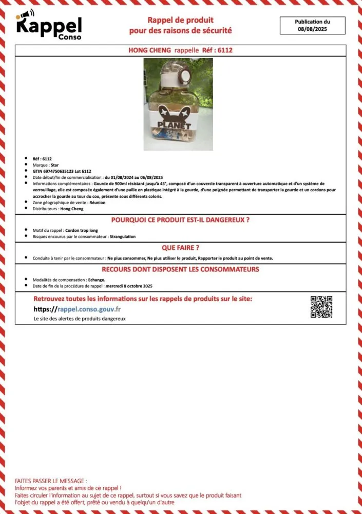 Il s’agit d’une gourde de 600 ml équipée d’un couvercle à ouverture automatique transparent avec paille intégrée, d’une poignée en plastique et d’un cordon permettant de la porter autour du cou. Ce modèle, disponible en différents coloris, a été commercialisé à La Réunion entre le 1er août 2024 et le 6 août 2025.