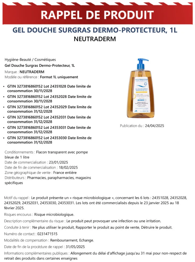 La marque Neutraderm procède au rappel de son gel douche surgras dermo-protecteur en format 1 litre, distribué dans toute la France en pharmacies, parapharmacies et magasins spécialisés. Six lots commercialisés entre le 23 janvier et le 18 février 2025 sont concernés. En cause, un risque microbiologique identifié qui pourrait provoquer des infections ou des irritations cutanées.