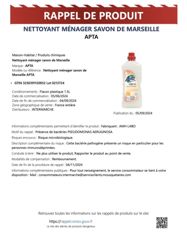 Rappel de produit : Nettoyant ménager savon de Marseille APTA