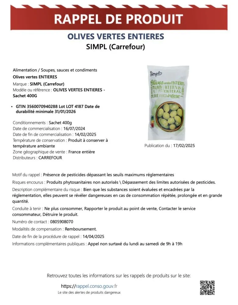 Un rappel de produit a été annoncé ce 17 février 2025 concernant les olives vertes entières de la marque SIMPL (Carrefour). Ce rappel fait suite à la présence de pesticides dépassant les seuils réglementaires, pouvant présenter un risque sanitaire en cas de consommation répétée.