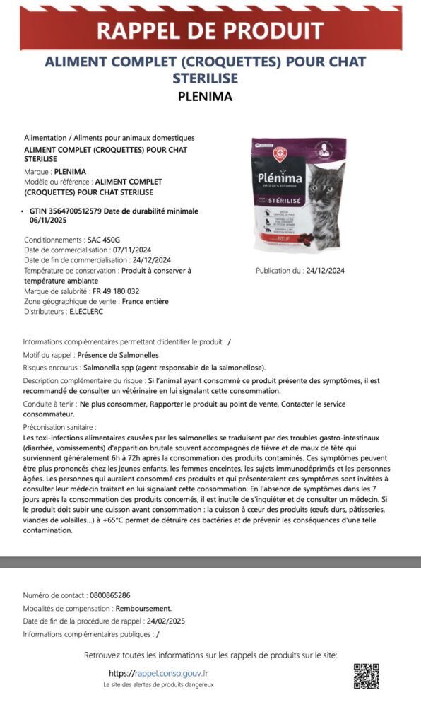 La marque Plenima procède au rappel immédiat de son produit “Aliment Complet (Croquettes) pour Chat Stérilisé”, distribué dans les magasins E.Leclerc à travers toute la France. Cette décision a été prise suite à la présence avérée de salmonelles (Salmonella spp), un agent pathogène responsable de la salmonellose.