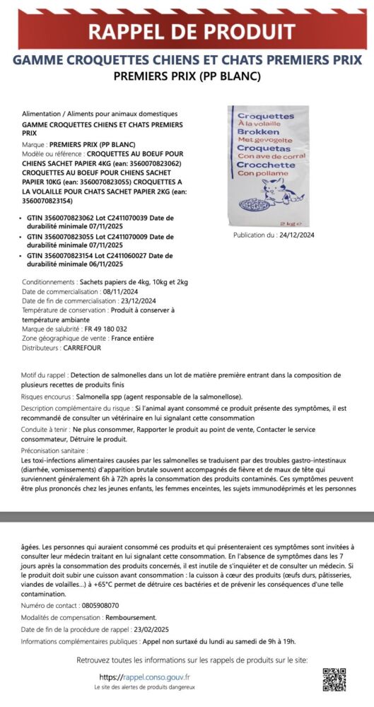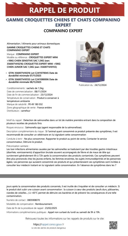 La marque Companino Expert procède au rappel immédiat de plusieurs lots de croquettes pour chiens et chats, commercialisés dans les magasins Carrefour à travers toute la France. Cette mesure préventive fait suite à la détection de salmonelles (Salmonella spp) dans un lot de matière première utilisée dans la fabrication de ces produits.