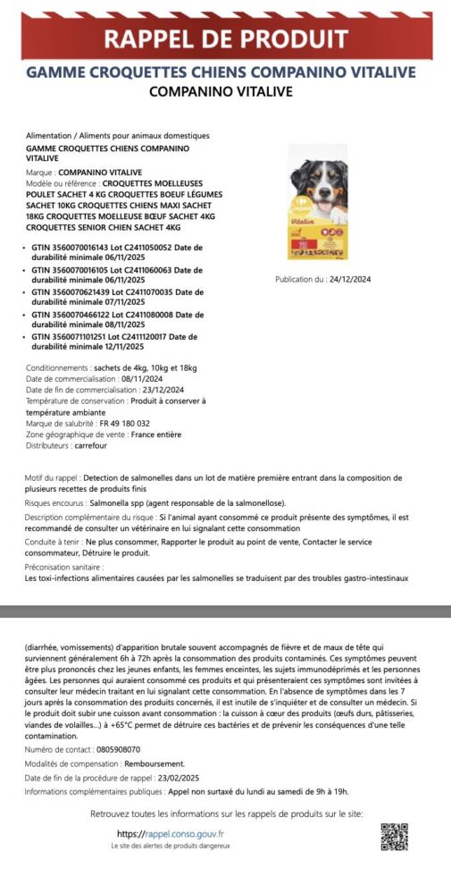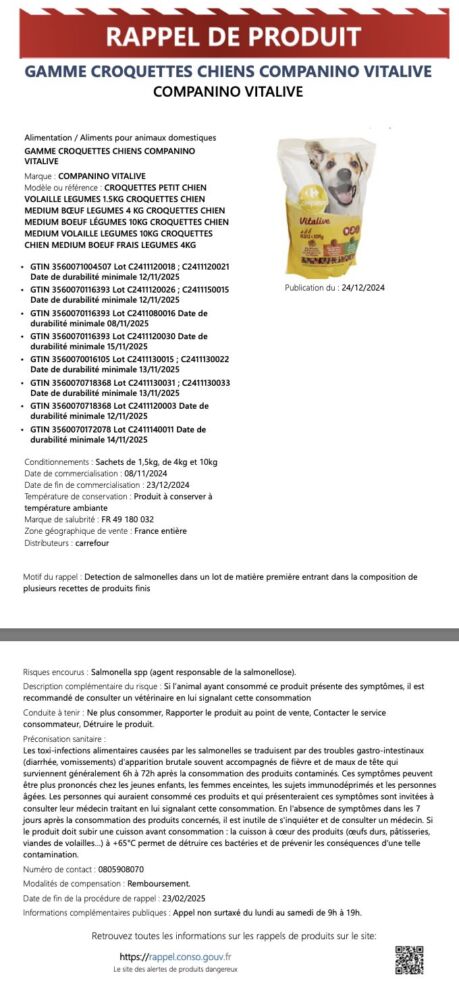 La marque Companino Vitalive procède au rappel immédiat de plusieurs lots de croquettes pour chiens, distribués dans les magasins Carrefour à travers la France entière. Ce rappel est lié à la détection de salmonelles (Salmonella spp) dans un lot de matière première utilisé dans la fabrication de plusieurs références de croquettes.