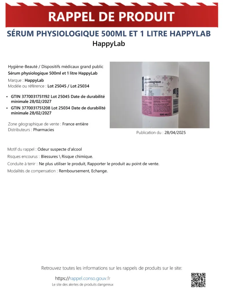 La marque HappyLab procède au rappel de lots de sérum physiologique 500 ml et 1 litre (Lots 25045 et 25034, DDM 28/02/2027) distribués dans toute la France en pharmacie.