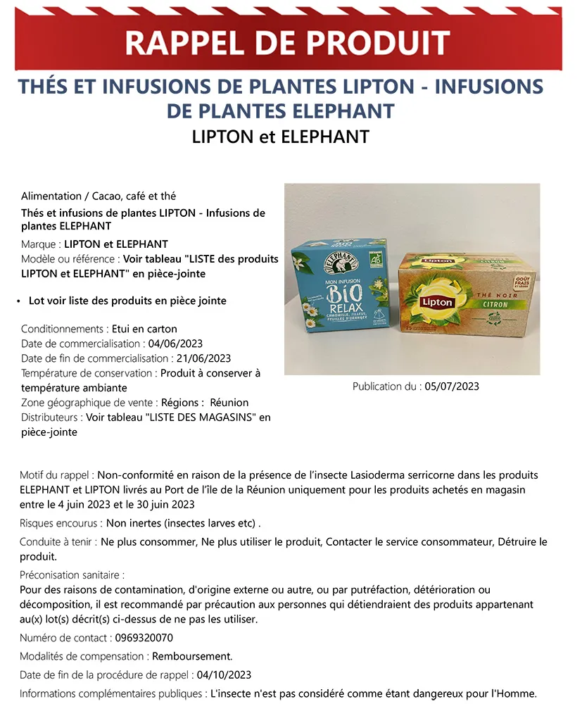 Si vous avez acheté du thé ou des infusions des marques Lipton ou Éléphant entre le 4 et le 21 juin derniers, vous pourriez avoir des sachets infestés d’insectes ou de larves de Lasioderma serricorne. Cependant, rassurez-vous, cet insecte n’est pas dangereux pour la santé humaine.