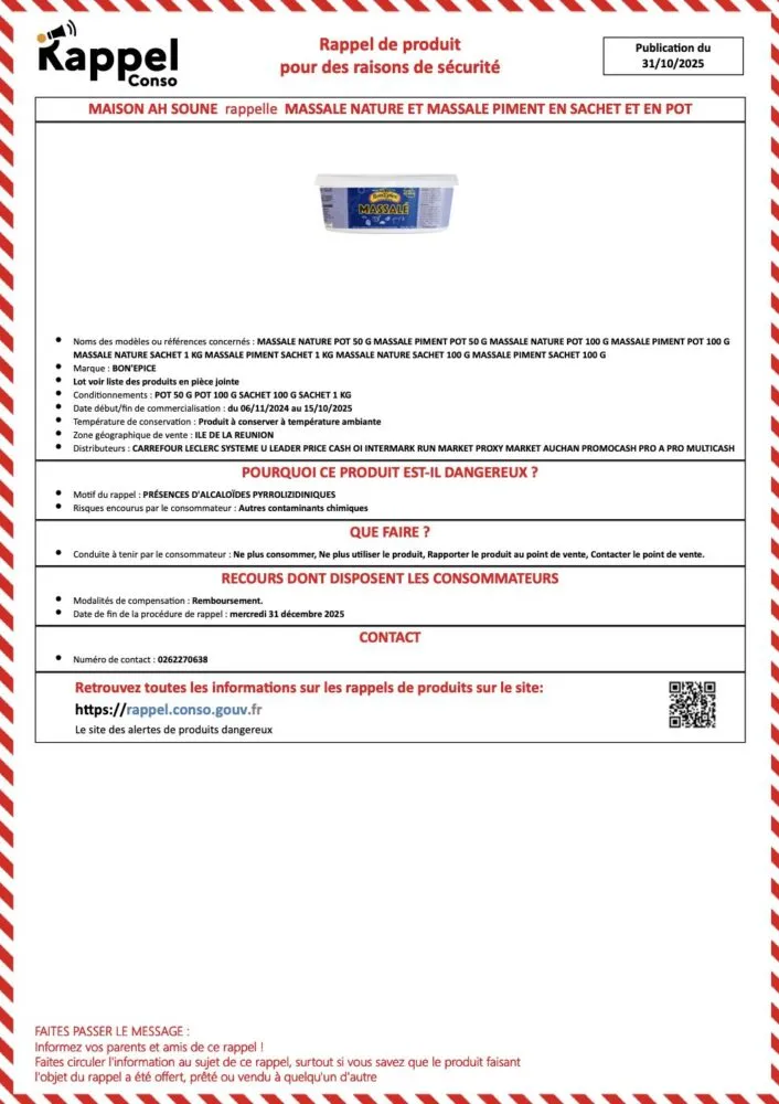 Les consommateurs sont invités à ne plus utiliser ni consommer ces épices, à les rapporter au point de vente et à demander un remboursement. La procédure de rappel est ouverte jusqu’au 31 décembre 2025.