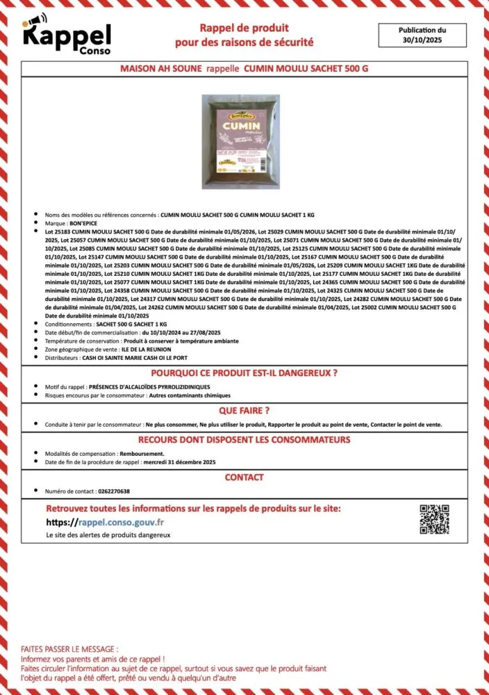 Les amateurs d’épices réunionnaises doivent redoubler de vigilance. Deux produits de la marque Bon’ Épice, conditionnés par la société Maison Ah Soune, font actuellement l’objet d’un rappel à La Réunion pour raisons sanitaires. Les produits concernés sont le cumin moulu et le massalé (nature et piment), vendus en pots et en sachets dans plusieurs enseignes de l’île.