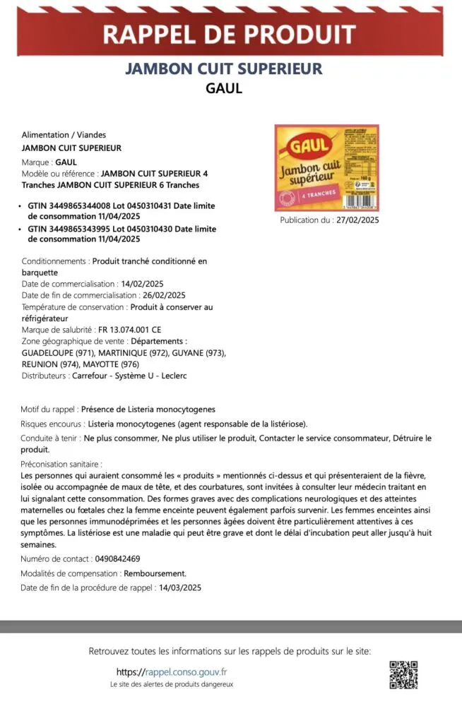La marque GAUL procède au rappel de ses produits Jambon Cuit Supérieur en raison de la présence de Listeria monocytogenes, une bactérie responsable de la listériose. Ce rappel concerne deux références commercialisées dans plusieurs départements d’outre-mer.