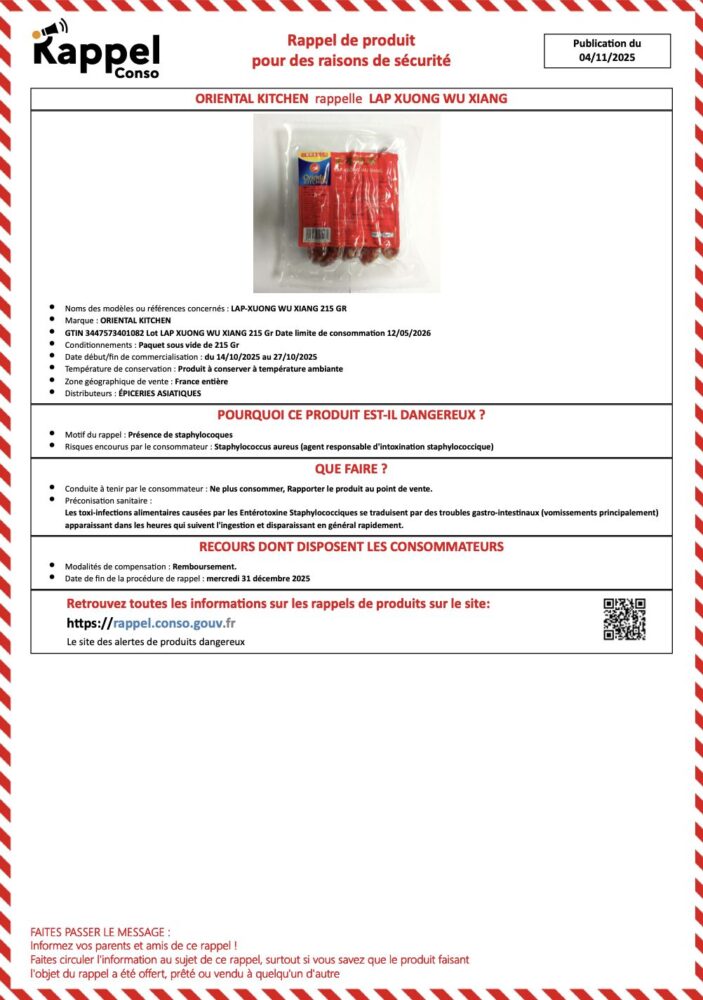 Les autorités sanitaires ont annoncé le rappel immédiat des saucisses chinoises “Lap Xuong Wu Xiang” (215 g) de la marque Oriental Kitchen, un produit largement distribué dans les épiceries asiatiques de La Réunion et dans l’Hexagone. Ce retrait fait suite à la présence de staphylocoques détectée dans certains lots, pouvant entraîner des risques d’intoxication alimentaire.