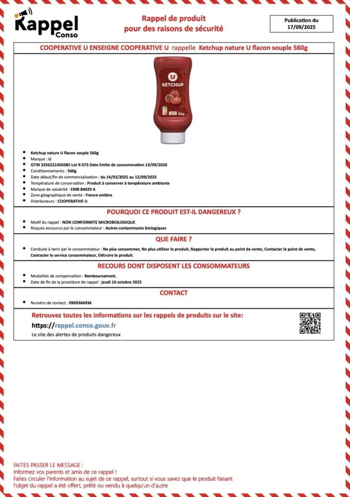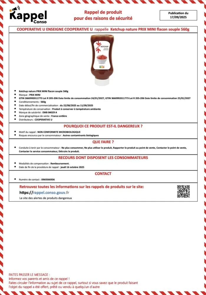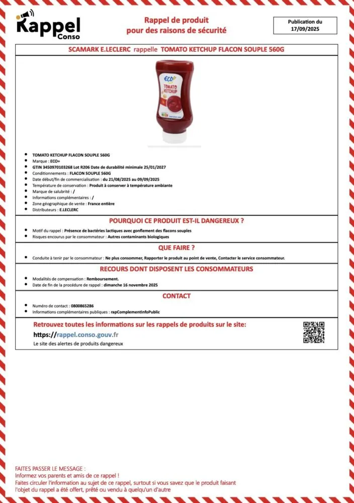 Plusieurs références de ketchup vendues en Métropole et à la Réunion font l’objet d’un rappel pour des raisons de sécurité sanitaire. Sont concernés des flacons de 560 g commercialisés sous différentes marques de distributeurs : Prix Mini (Coopérative U), U (Coopérative U) et ECO+ (E.Leclerc).