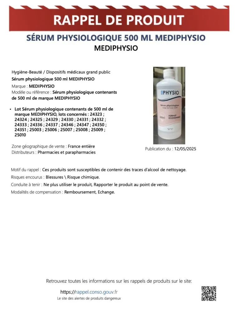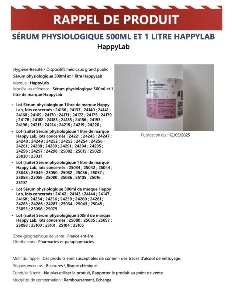 Le premier signalement remonte à fin avril, lorsque deux lots de sérum physiologique de la marque HappyLab avaient été retirés des rayons. L’origine du problème : la suspicion de traces d’alcool de nettoyage dans le liquide, pourtant destiné à un usage médical sensible.