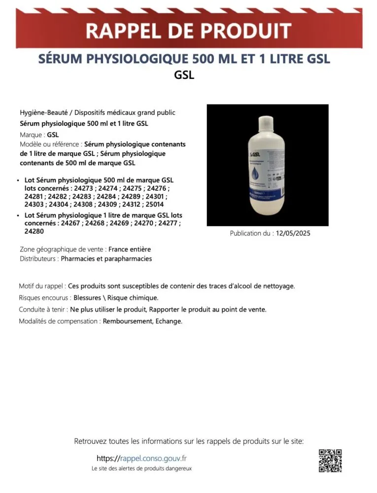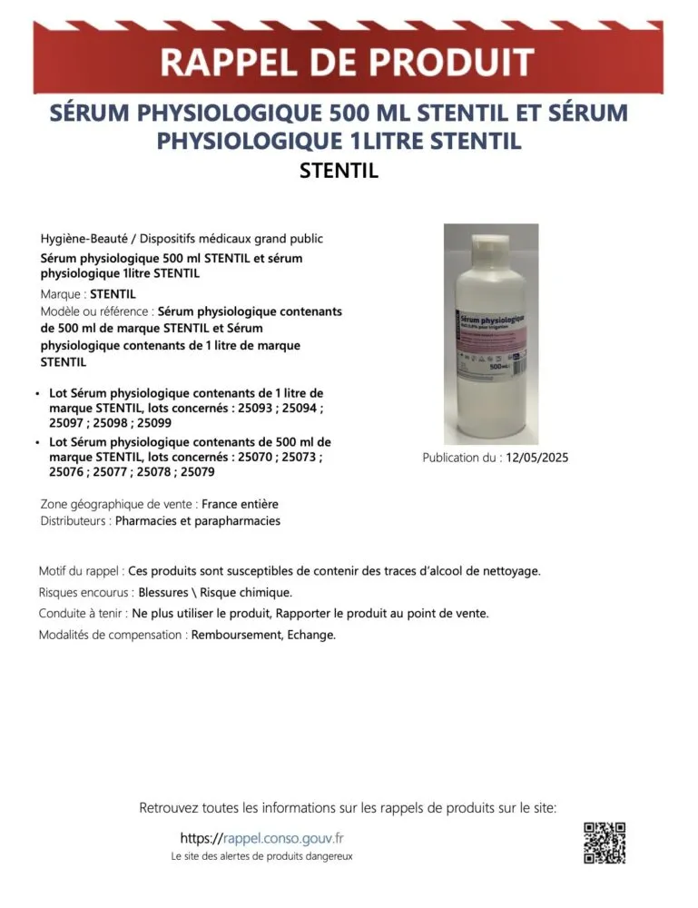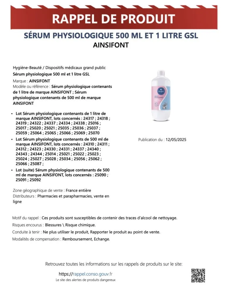 Une alerte sanitaire nationale a été lancée ce lundi 12 mai concernant plusieurs marques de sérums physiologiques vendus en France. En cause : la possible présence de résidus d’alcool industriel dans certaines bouteilles. Cette décision fait suite à une enquête sanitaire déclenchée après un premier retrait ciblé le mois dernier.
