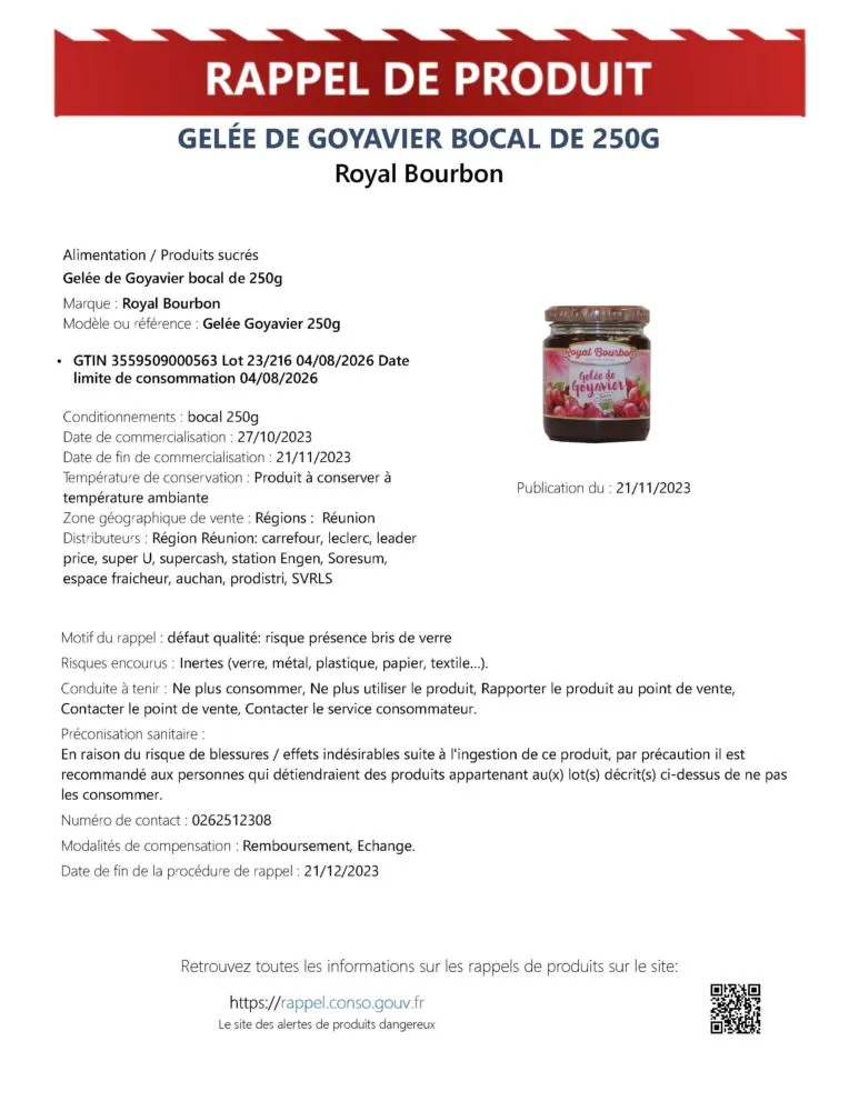 Motif du rappel : défaut qualité: risque présence bris de verre