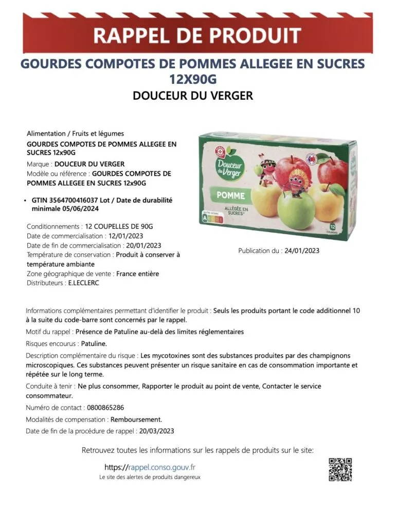 Motif du rappel : Présence de Patuline au-delà des limites réglementaires Risques encourus : Patuline.
