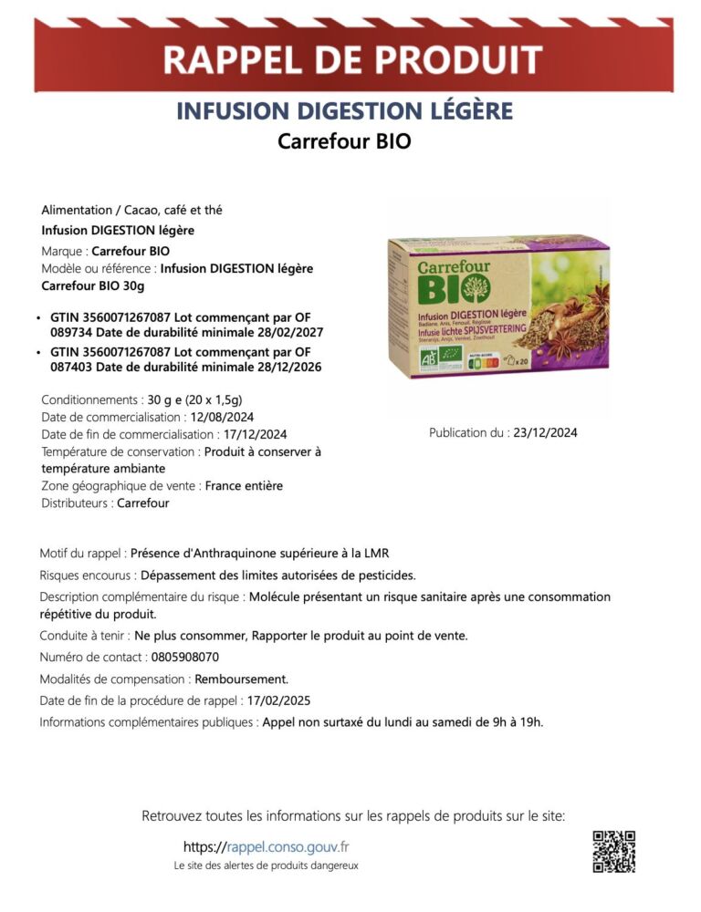 La marque Carrefour BIO procède au rappel de son produit Infusion DIGESTION LÉGÈRE (30g, 20 sachets de 1,5g) en raison d’une présence d’anthraquinone supérieure à la limite maximale réglementaire (LMR).